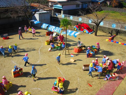 園庭に道路・線路・横断歩道・・・。 海・空まで・・・。