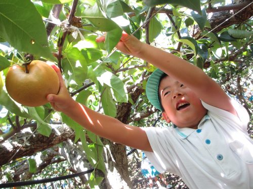 初めての梨狩りでしたが、手をう~んと伸ばして上手に収穫でき、満足気な表情を見せてくれた子ども達でした。また、あま~い梨の試食ではほっぺがおちそうなくらい幸せな表情をしていました。