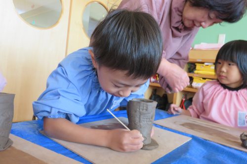栄ヶ丘幼稚園 きぼうの森こども園 新着情報News ホーム > 新着情報 > 【栄ヶ丘幼稚園】陶芸教室ーきく組ー 【栄ヶ丘幼稚園】陶芸教室ーきく組ー 2019.02.15 楽しみにしていた 年長さんだけの陶芸教室! 「さぁ 今日は鉛筆立てを作りますよ」 と、陶芸の先生がお手本を見せて下さると 「かっこいいーーー!!!」と目がキラキラ☆彡 「まずはペタペタ伸ばして好きな模様をつけて・・・」 真剣に作り方を聞き、思い思いの鉛筆立てを作りました。 みんなの作品を並べると、ハートの形に三角、取っ手付きのものまで!! 完成した作品は卒園記念品として受け取ります。 お楽しみに!! 一覧へ戻る アーカイブ 20252024202320222021202020192018201720162015201420132012