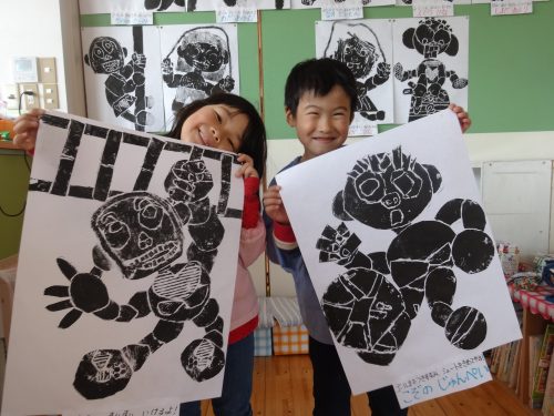 版画刷りにも挑戦し、出来上がった版画を見て「すごーい!!」と驚きと嬉しさを味わっていました☆